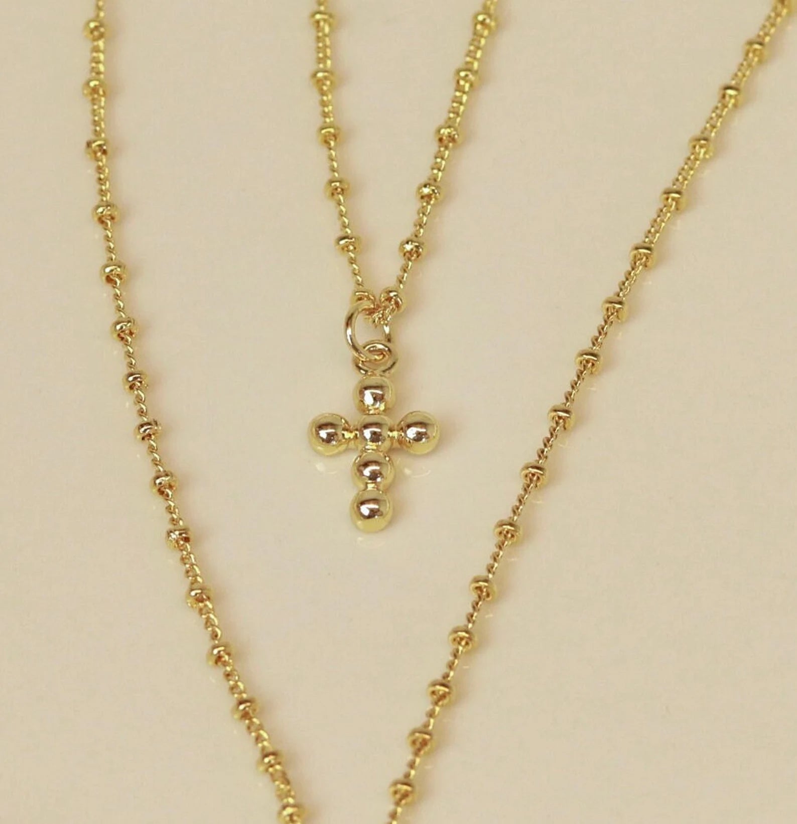 This 16" gold-plated satellite chain features a delicate petite bubble cross charm, crafted from durable gold-plated stainless steel. Its adjustable length ensures a perfect fit, while the tarnish-resistant finish makes it ideal for everyday wear. Designed for effortless stacking, this refined piece adds subtle elegance to your jewelry collection.