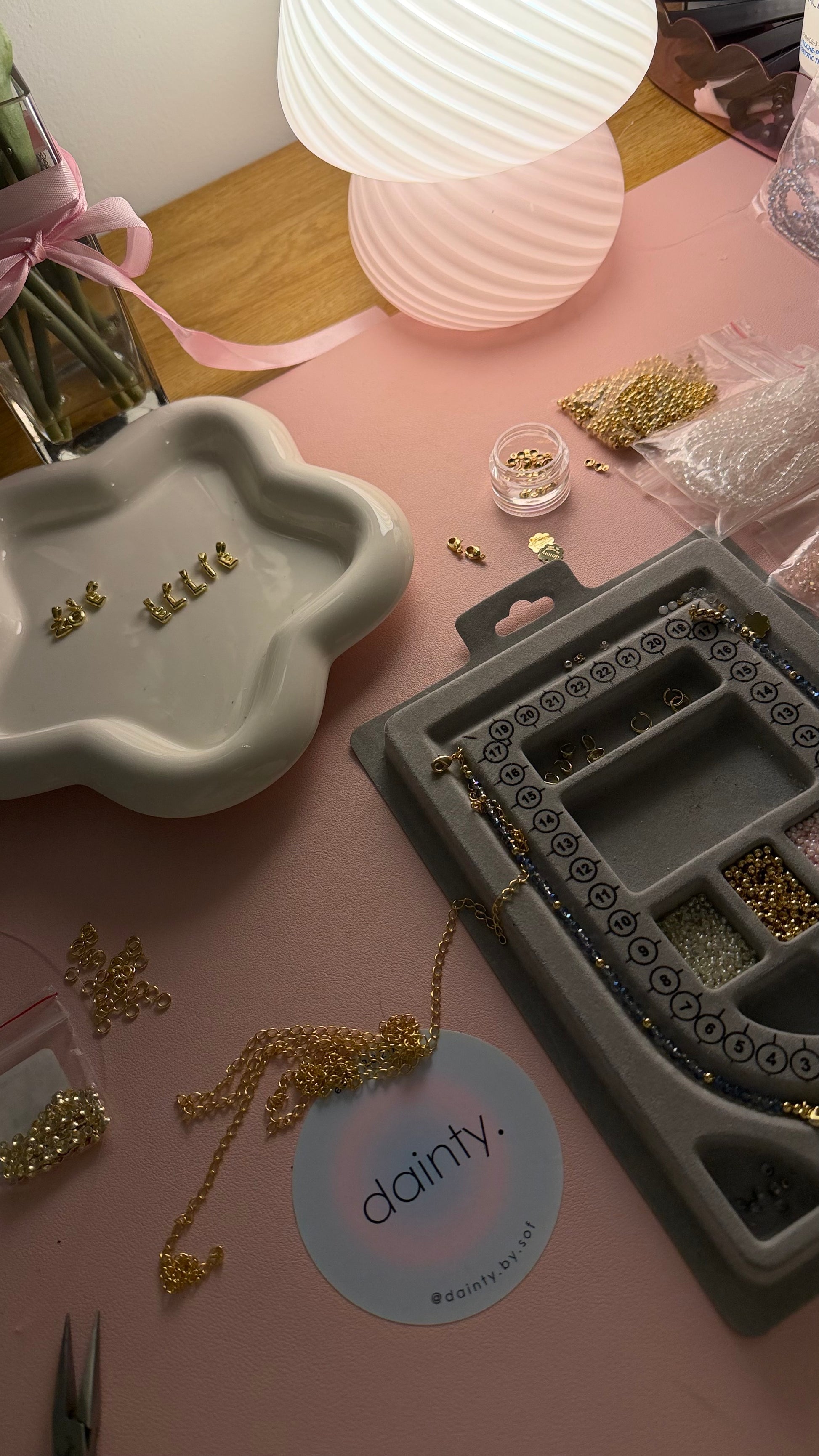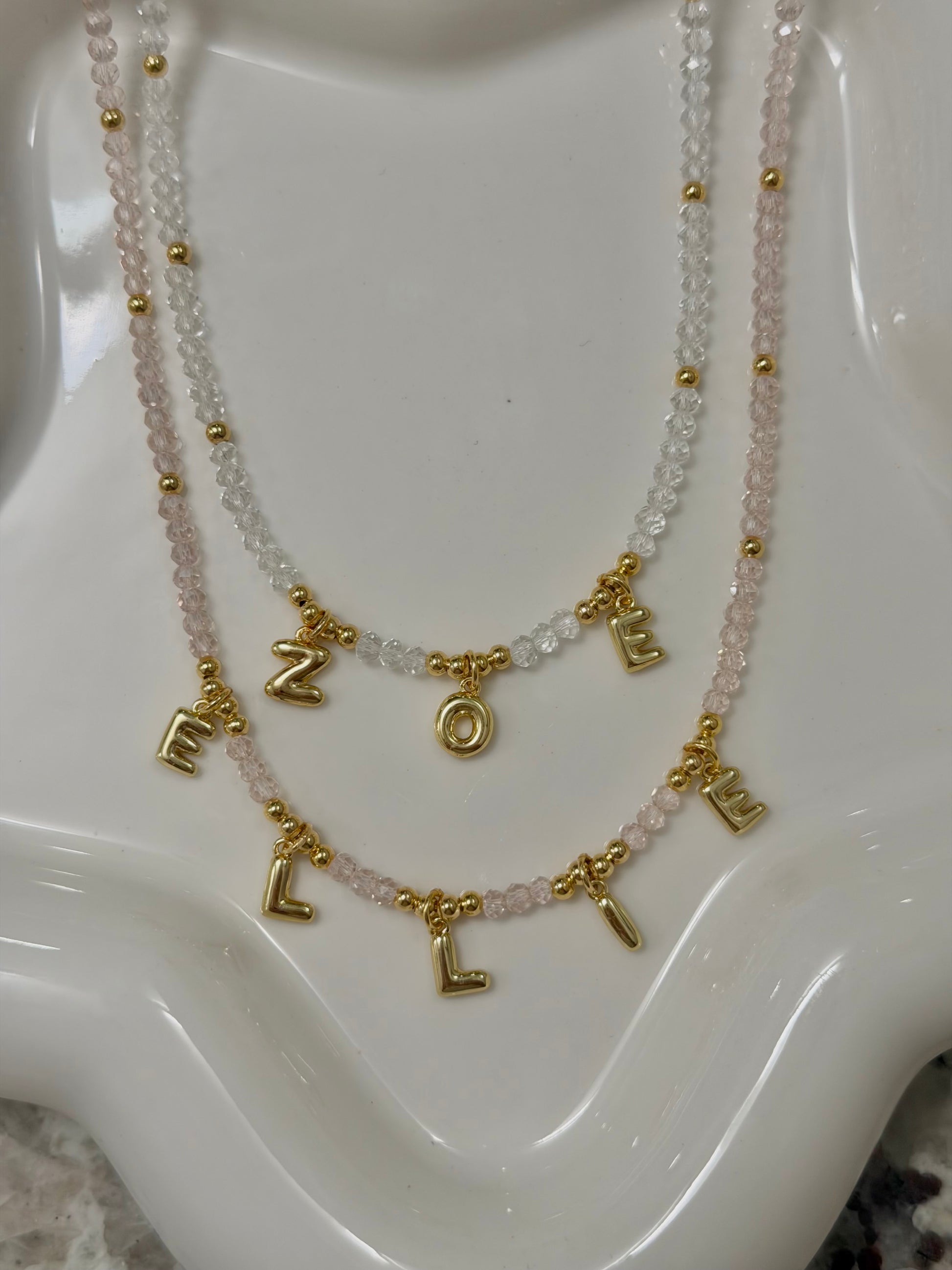 the necklace you’ve been looking for :) customized, ready for stacking, and the length is adjustable! 18k gold-plated letters and crystal beads 🤍